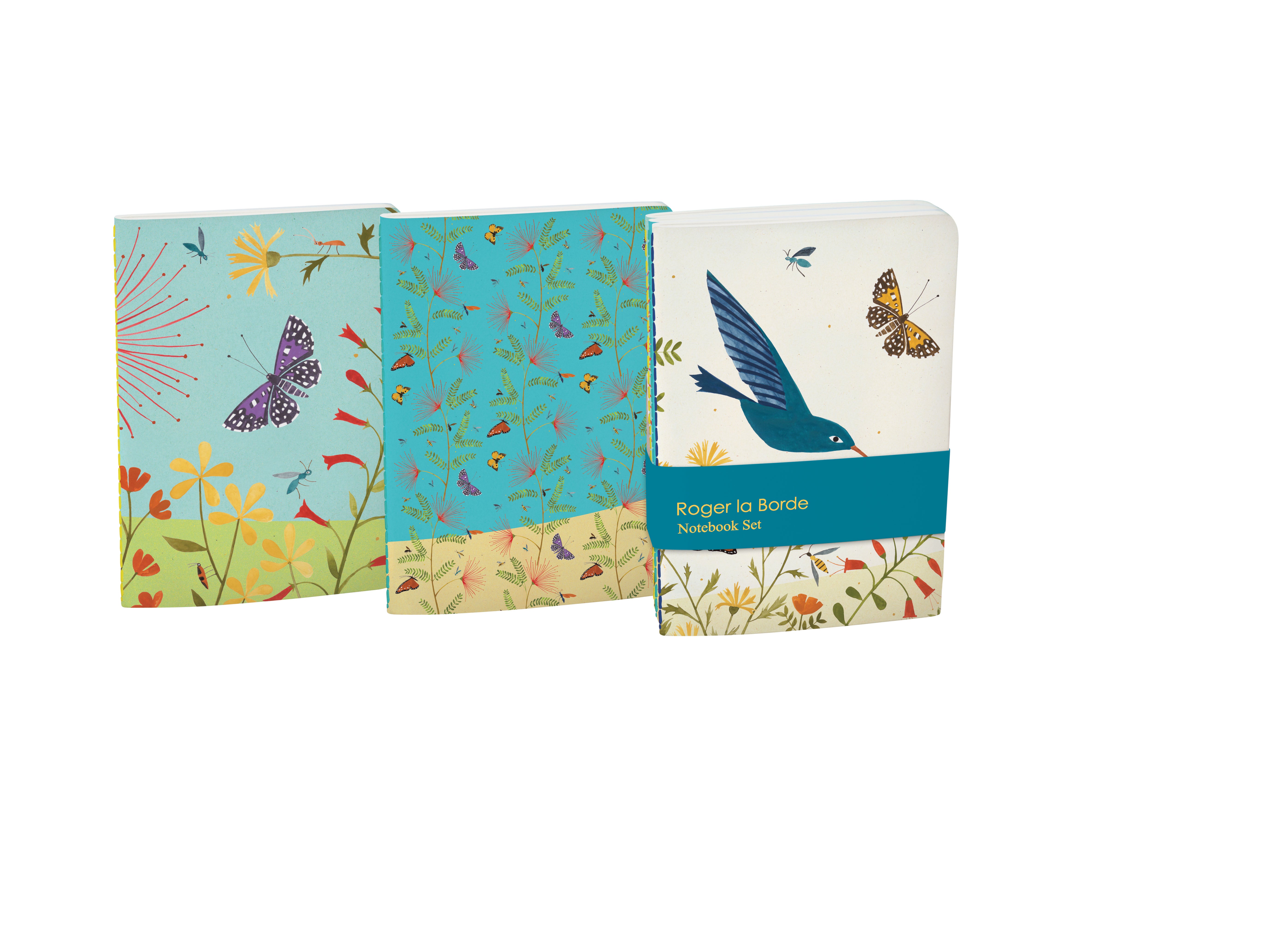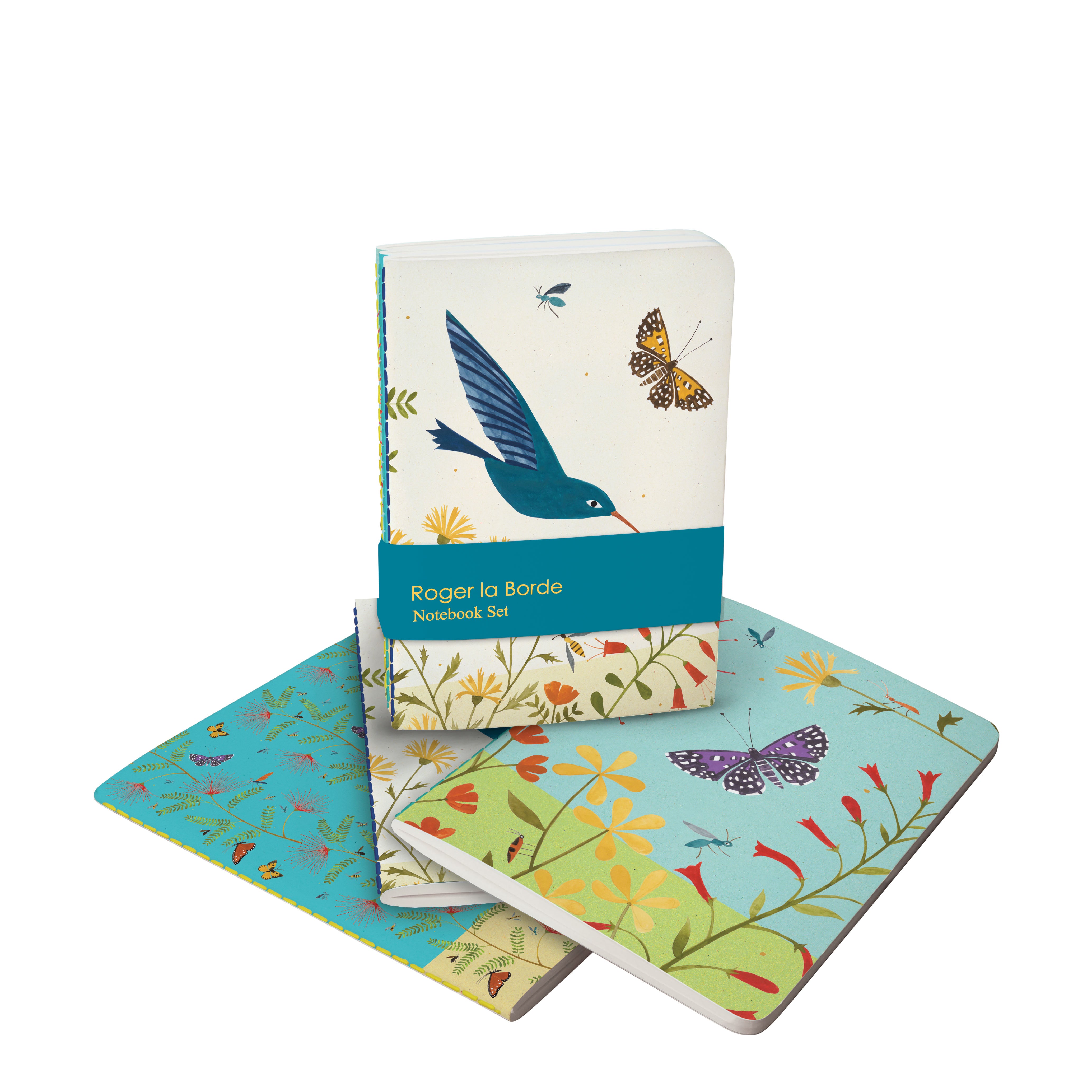 A trio of small stylish books in three different designs. These A6 Exercise Books have vibrantly illustrated covers with visible stitched binding on the spine.