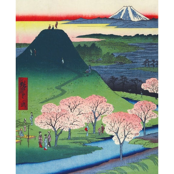 This view documents the late Edo practice of constructing miniature replicas of Mount Fuji. The first such mini-Fuji was constructed in 1779 by a practitioner of Fujikō, a popular religion that worshipped the famed mountain as a god. The idea was to provide a chance to climb Mount Fuji for those normally unable to do so. The mini-Fuji in the foreground was built in 1819. A zigzag path along the slope mimics the switchback route up the real mountain.