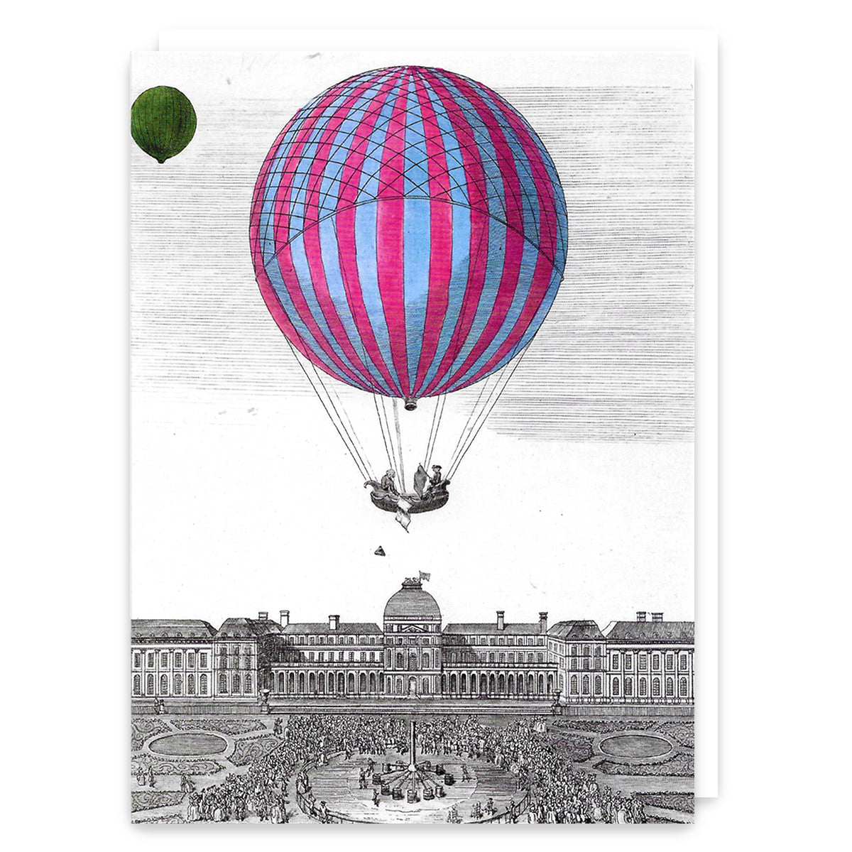 The image of this greetings card depicts the first ascent in a hydrogen gas filled balloon, in 1783, by Jacques Charles and Aine Robert.