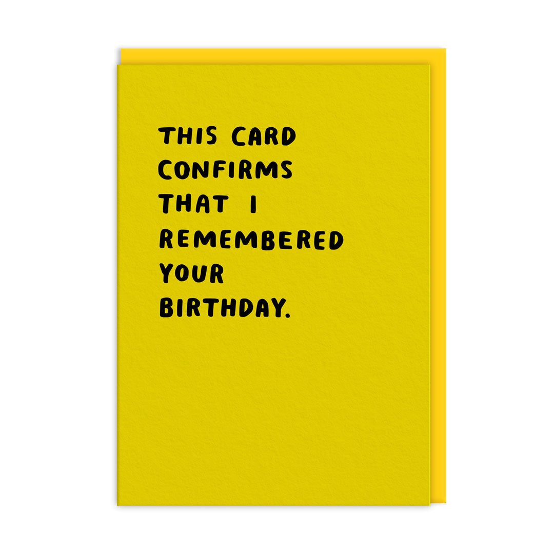 - Front reads: This Card Confirms That I Remembered Your Birthday.