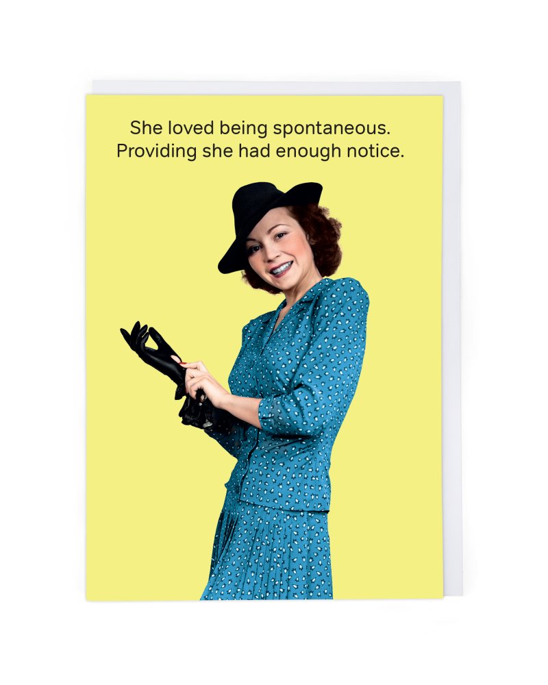 - Front reads: She loved being spontaneous. Providing she had enough notice.