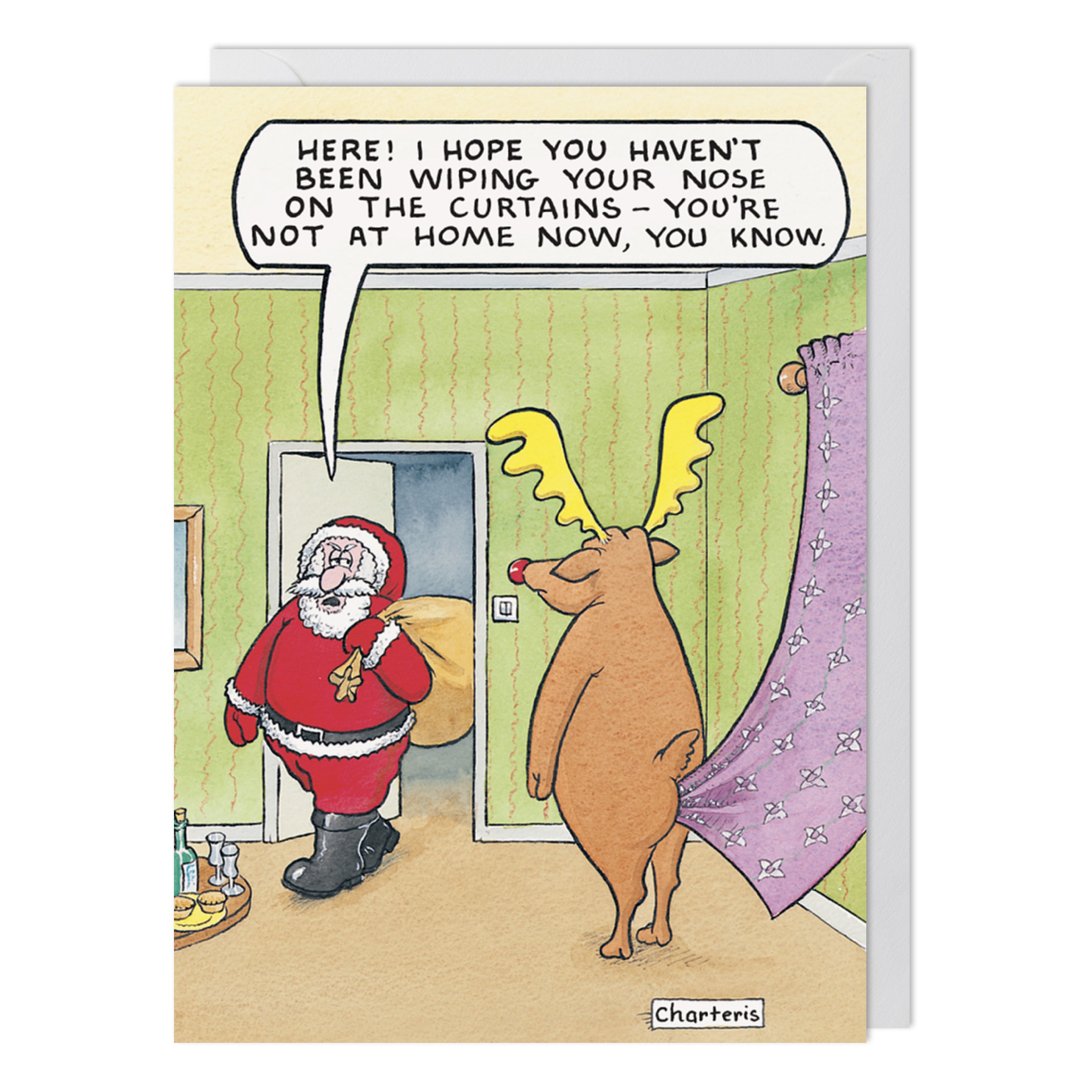 - Front reads: "Here! I hope you haven't been wiping your nose on the curtains - you're not at home now, you know!"