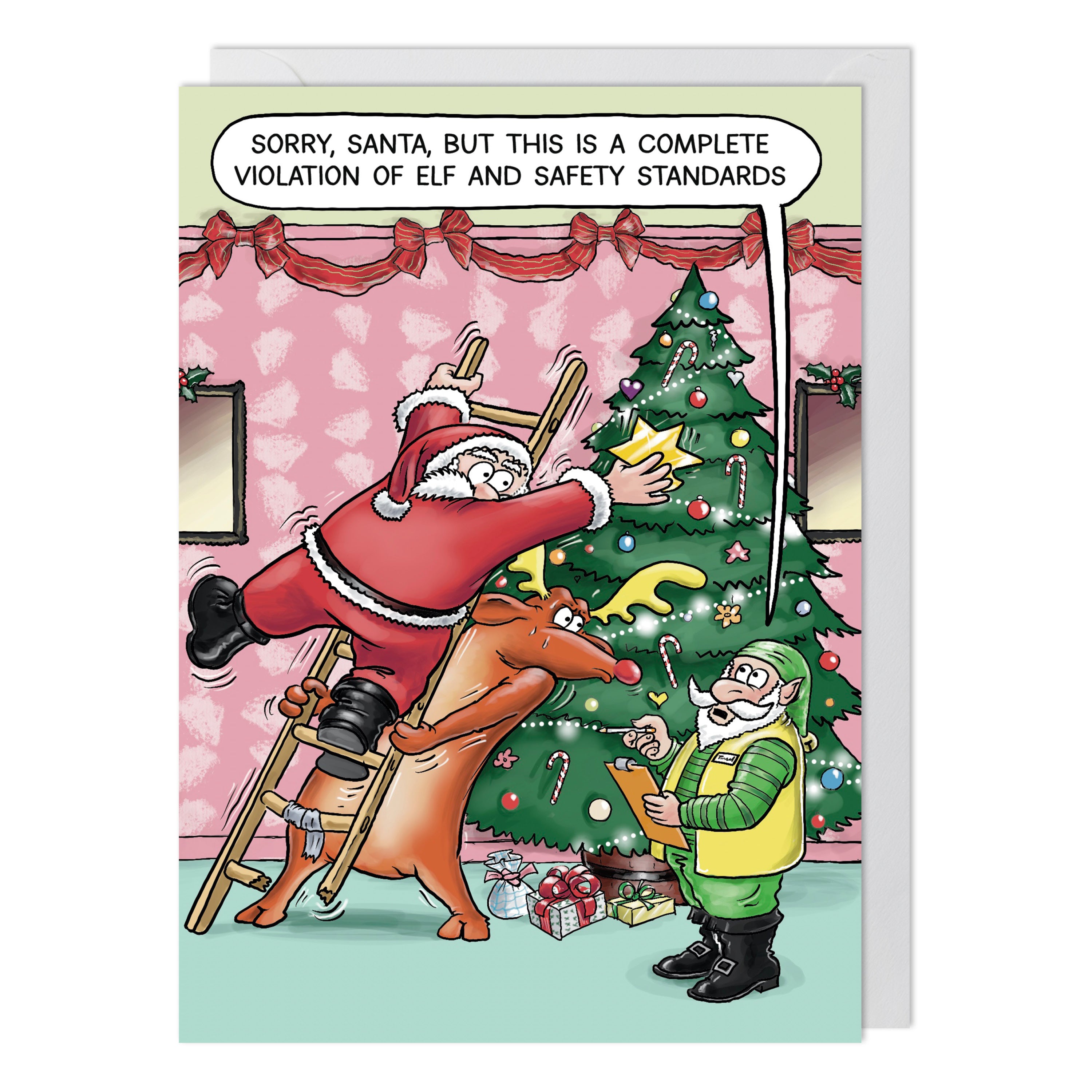 - Front reads: "Sorry, Santa, but this is a complete violation of Elf and Safety Standards"
