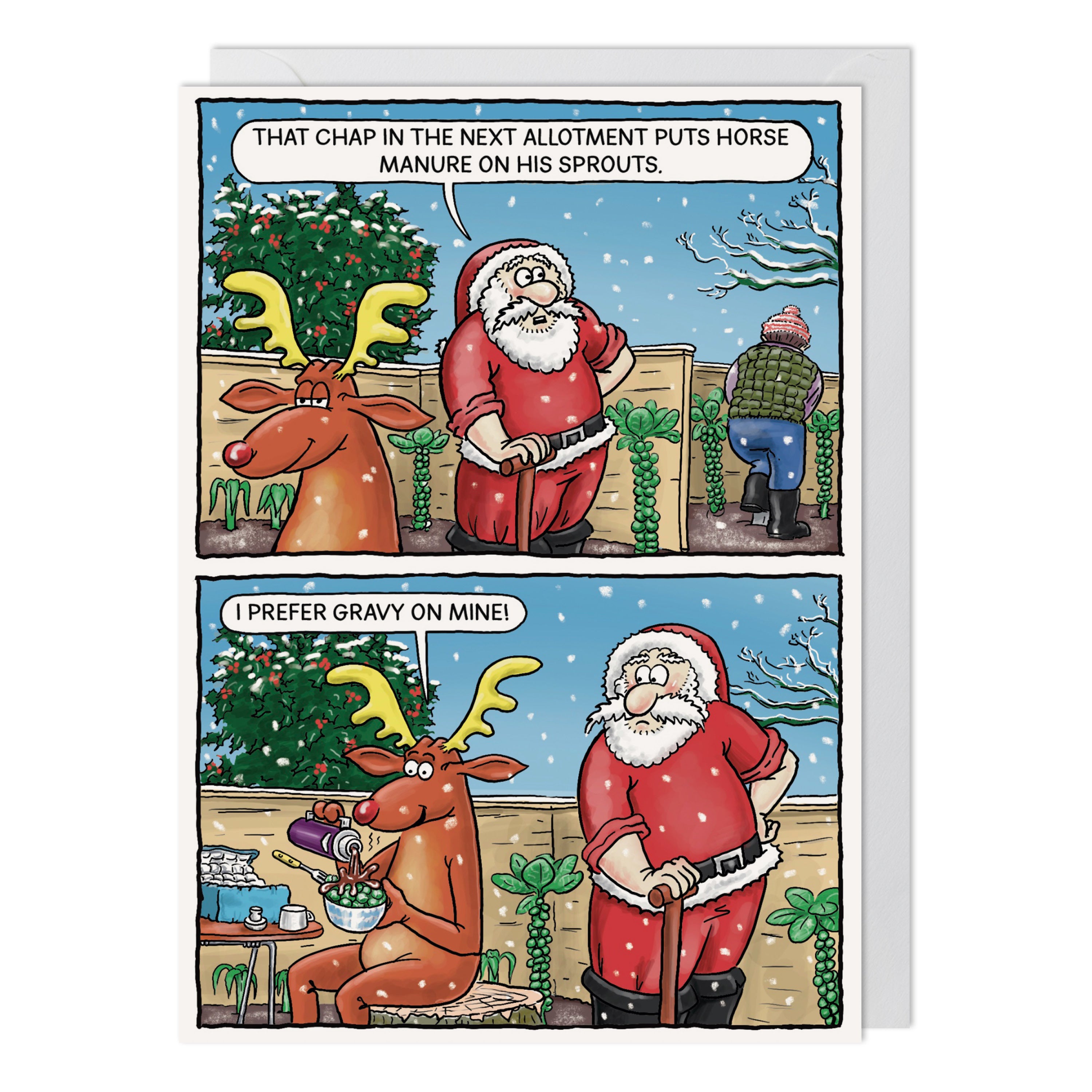 - Front reads: "That chap in the next allotment puts horse manure on his sprouts"..."I prefer gravy on mine!"