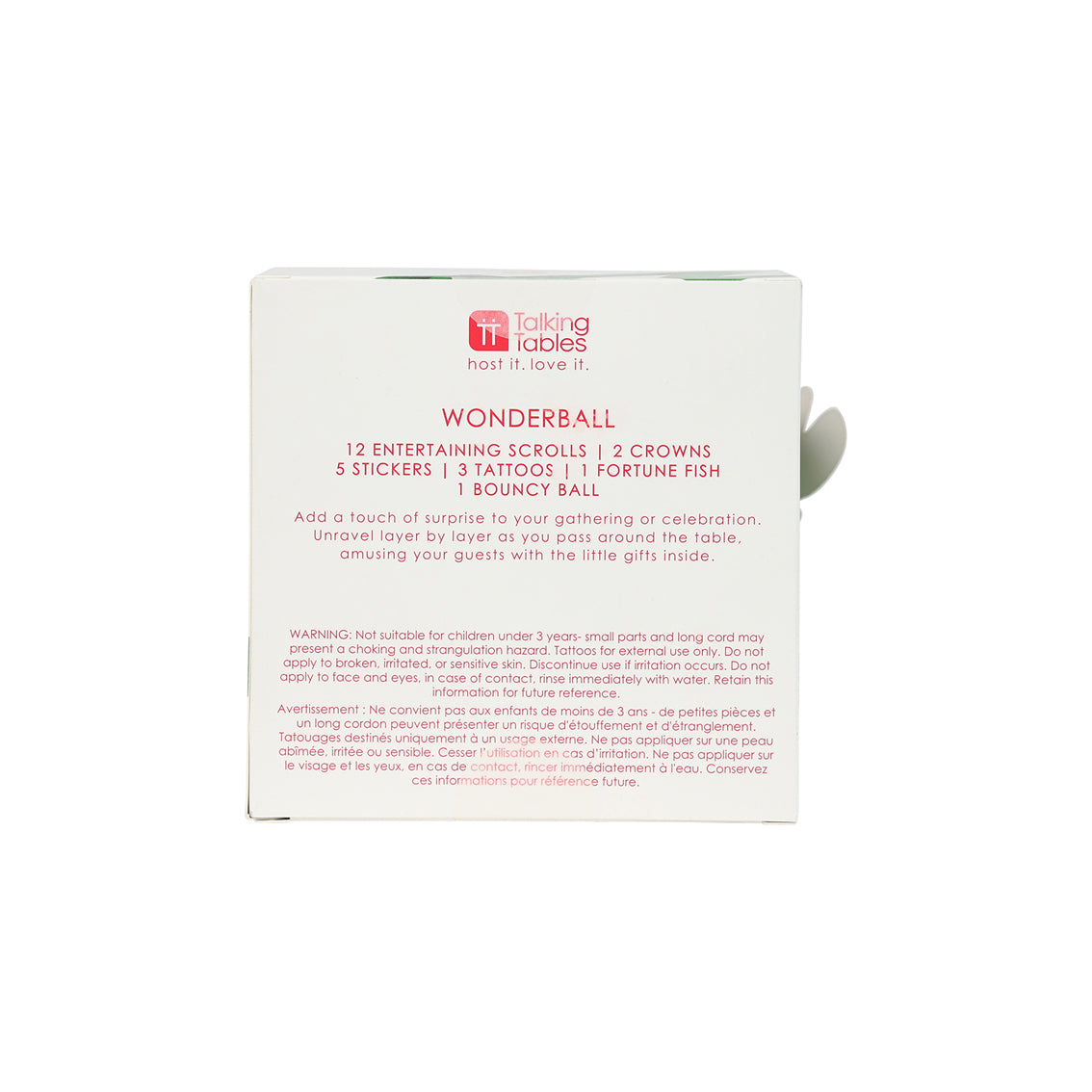 A festive twist on pass the parcel, this sprout-shaped wonderball is packed with laughs, challenges and surprises. Layer by layer, guests unwrap scrolls with jokes, trivia and mini games, plus small treats like stickers, party crowns and tattoos. It’s designed to bring joyful moments to the table