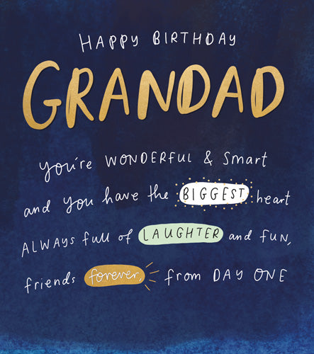 - Front reads: Happy Birthday Grandad - You're Wonderful & Smart And You Have The Biggest Heart - Always Full Of Laughter And Fun, Friends Forever From Day One!