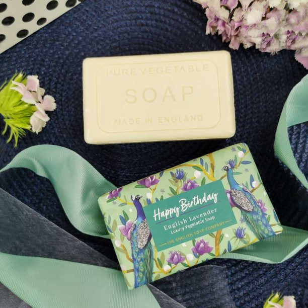 Say Happy Birthday with a vegan friendly, luxury soap bar, printed with hand-illustrated floral branches, elegant peacocks and a ‘Happy Birthday’ message in beautiful colours. Made using pure vegetable oils and enriched with shea butter to keep skin feeling nourished. This luxury soap makes a beautiful, sustainable gift to wish a Happy Birthday and make someone’s day.