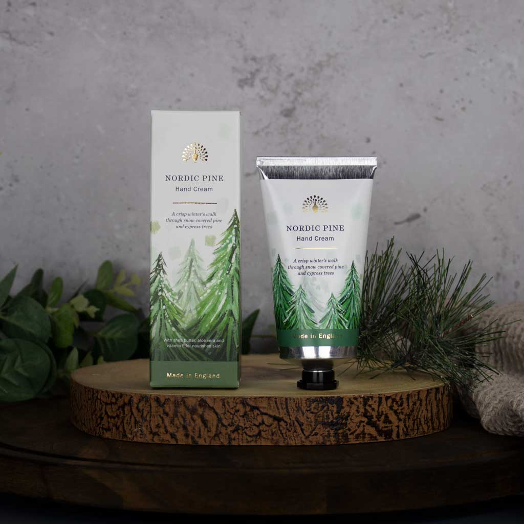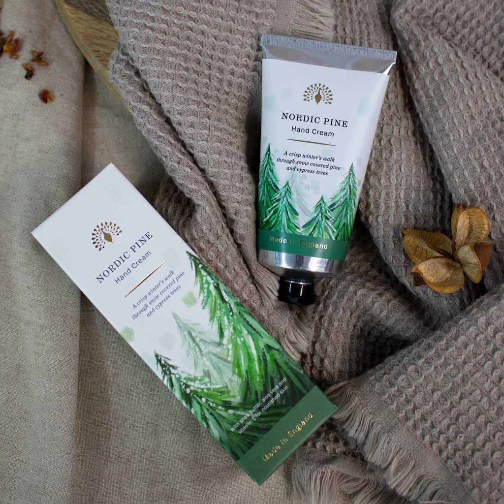 This nourishing Wintertide Nordic Pine Hand Cream has a festive scent that will transport you to a winter walk through snow-topped pine trees. With top notes of pine and cypress, the fragrance develops into a heart of sandalwood, cedarwood, and cinnamon. A rich base of patchouli, frankincense and amber complete the scent.