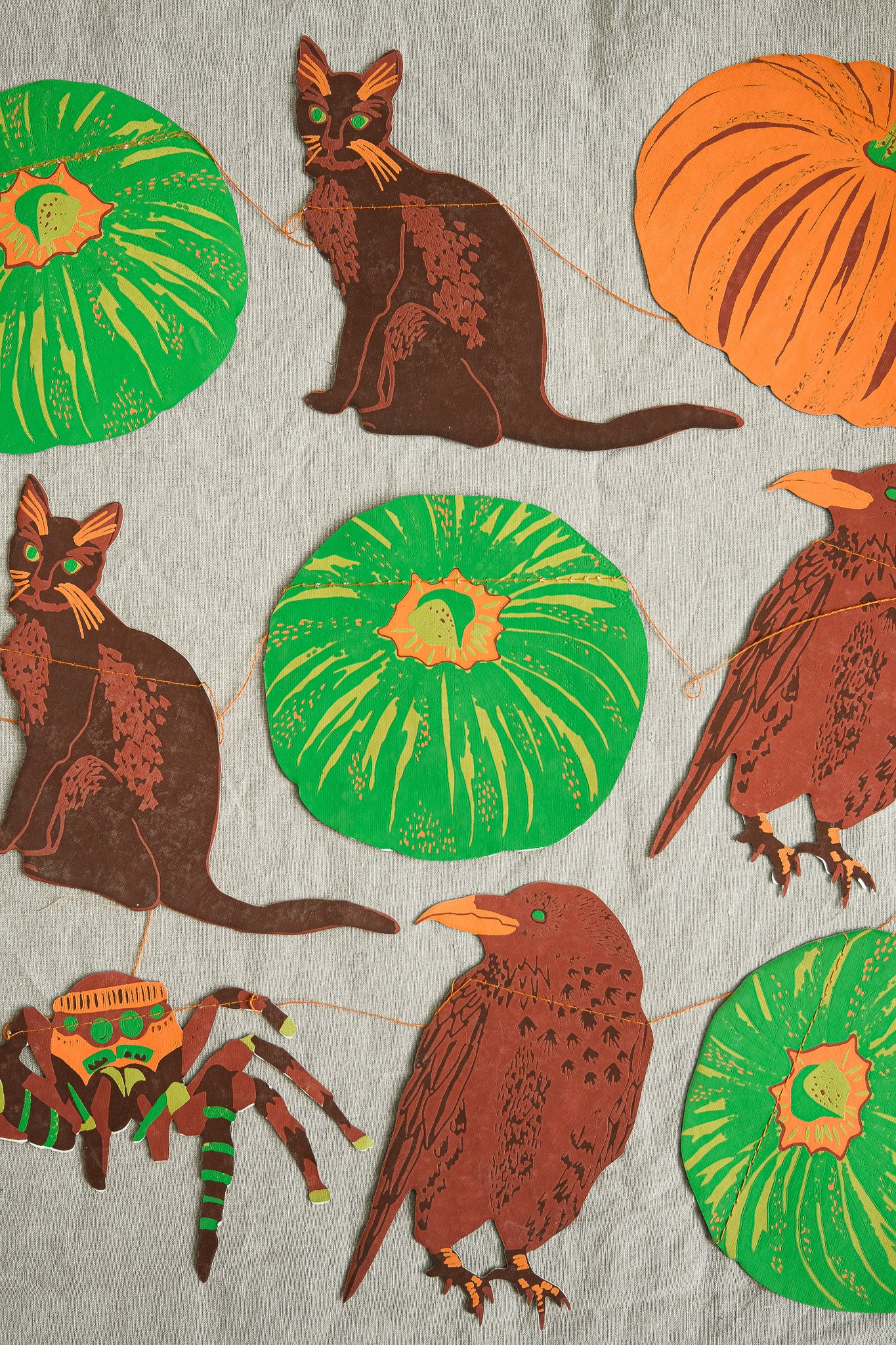 In bold greens and bright oranges, this garland features all the traditional images of Halloween - cats, ravens, spiders and pumpkins!