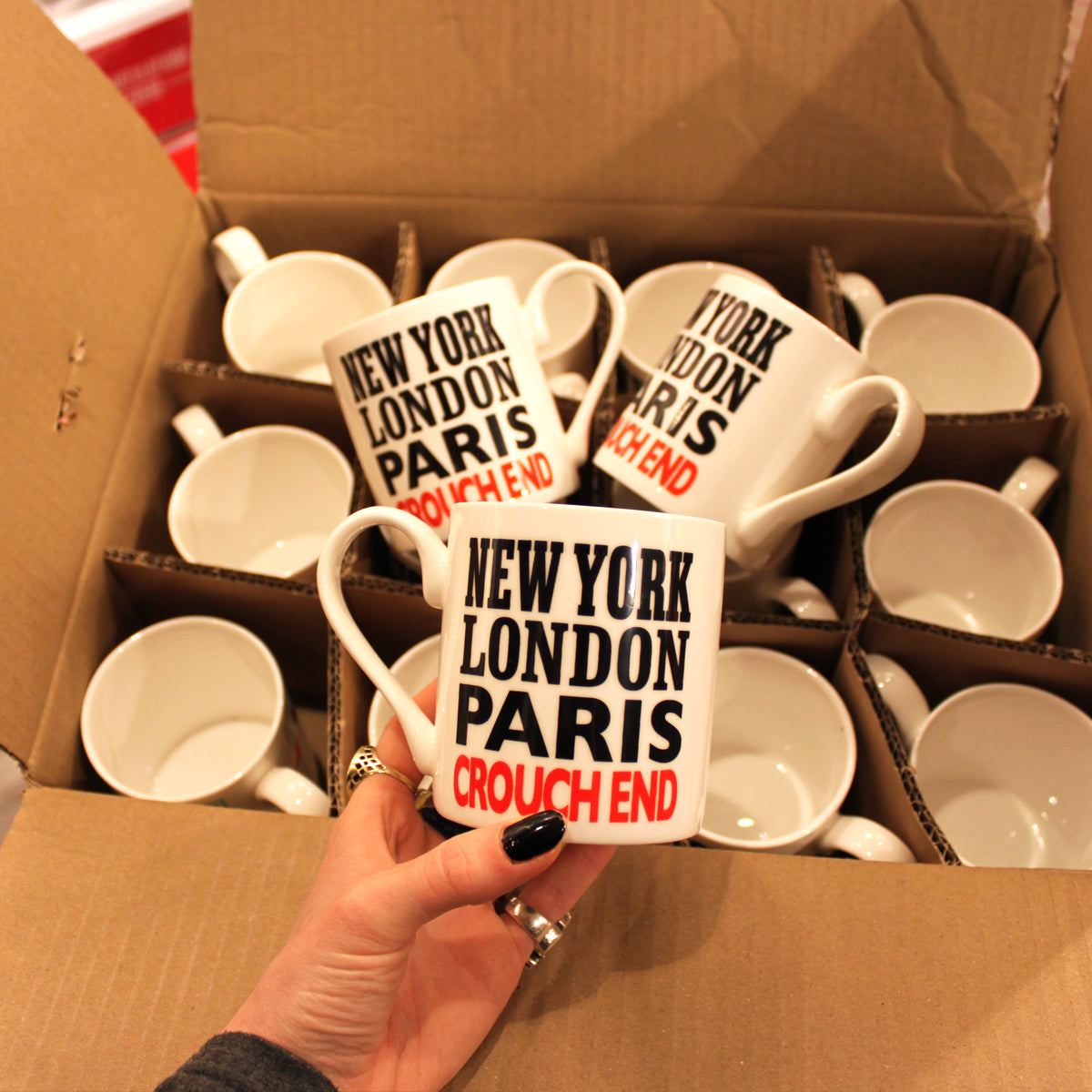 This Bone Chine Mug reads New York London Paris Crouch End on the front and on the reverse.