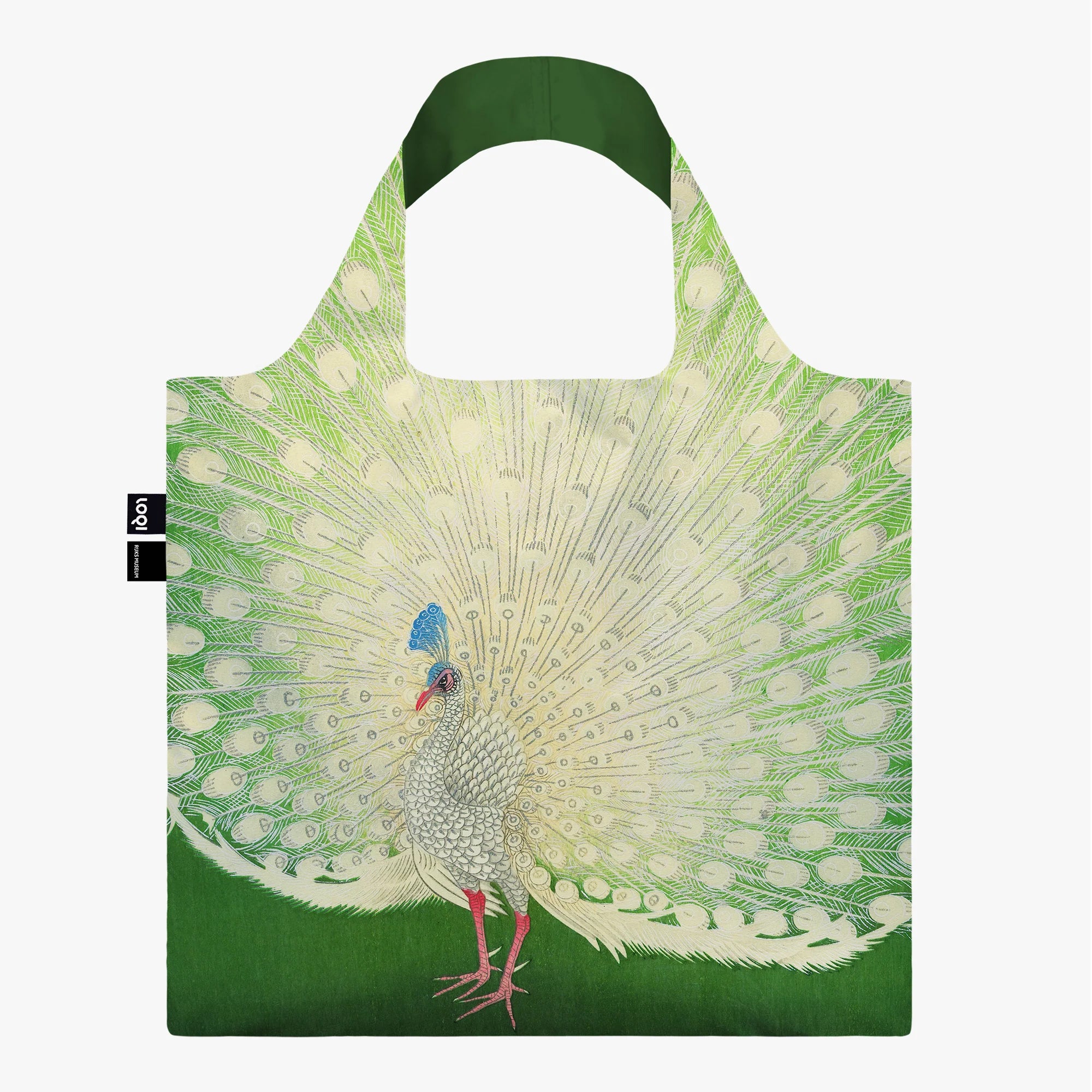 The intricacy of the natural world. Delicate outlines and intricate details. Bright washes of colour. Ohara Koson, a renowned Japanese artist, is celebrated for his kachō-e (bird and flower) prints, including this vibrant peacock on the recycled tote bag.