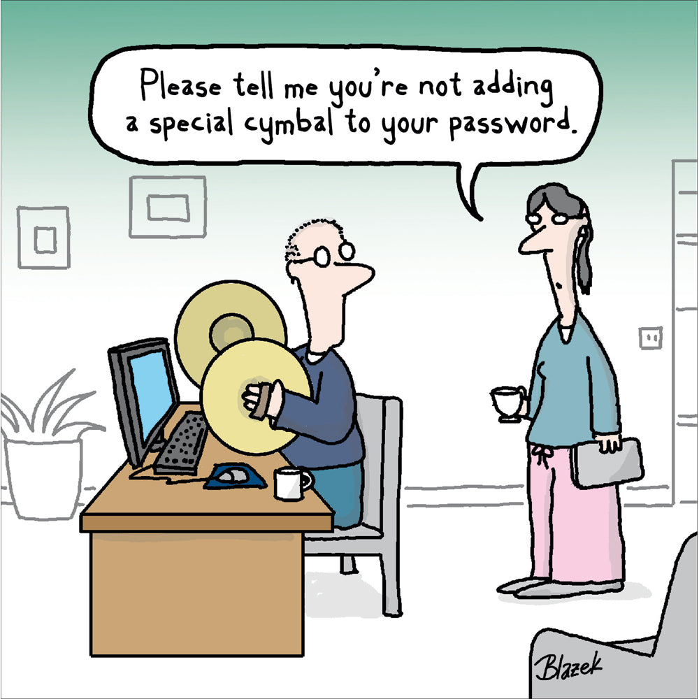 - Front reads: Please tell me you're not adding a special cymbal to your password.