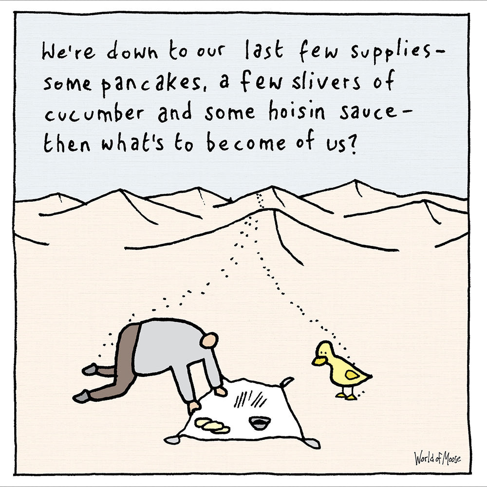 - Front reads: "We're down to our last few supplies - some pancakes, a few slivers of cucumber and some hoisin sauce - then what's to become of us?"