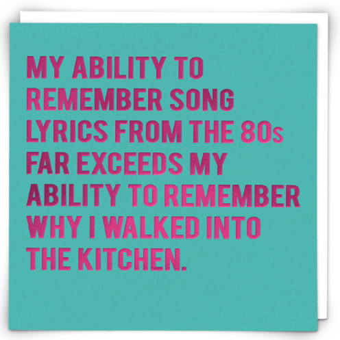 • Front reads:  My Ability to Remember Song Lyrics From the 80s Far Exceeds My Ability to Remember Why I Walked into the Kitchen