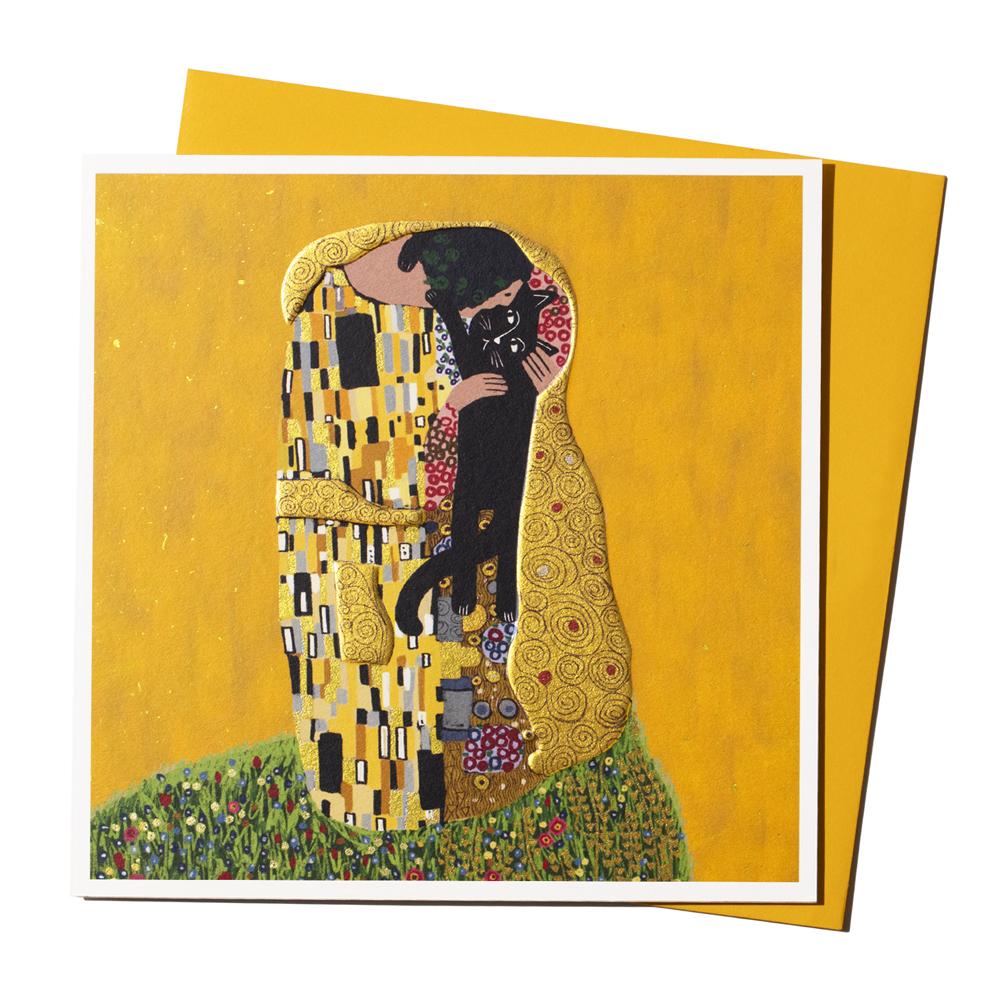 Niaski 'Cats in Art' greeting card no.13 is a feline interpretation of Gustav Klimt's 'The Kiss' - illustrated by Nia Gould