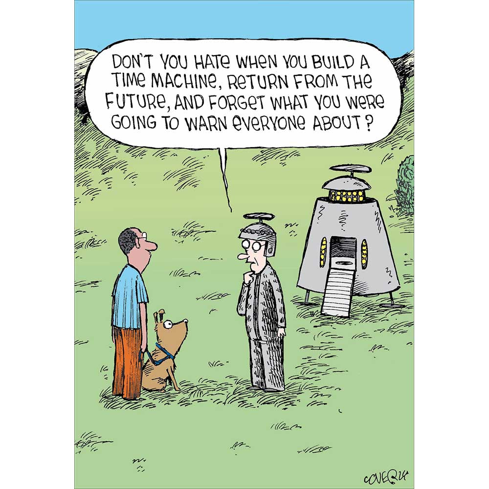 • Front reads:  "Don't You Hate When You Build A Time Machine, Return From The Future, And Forget What You Were Going To Warn Everyone About?"