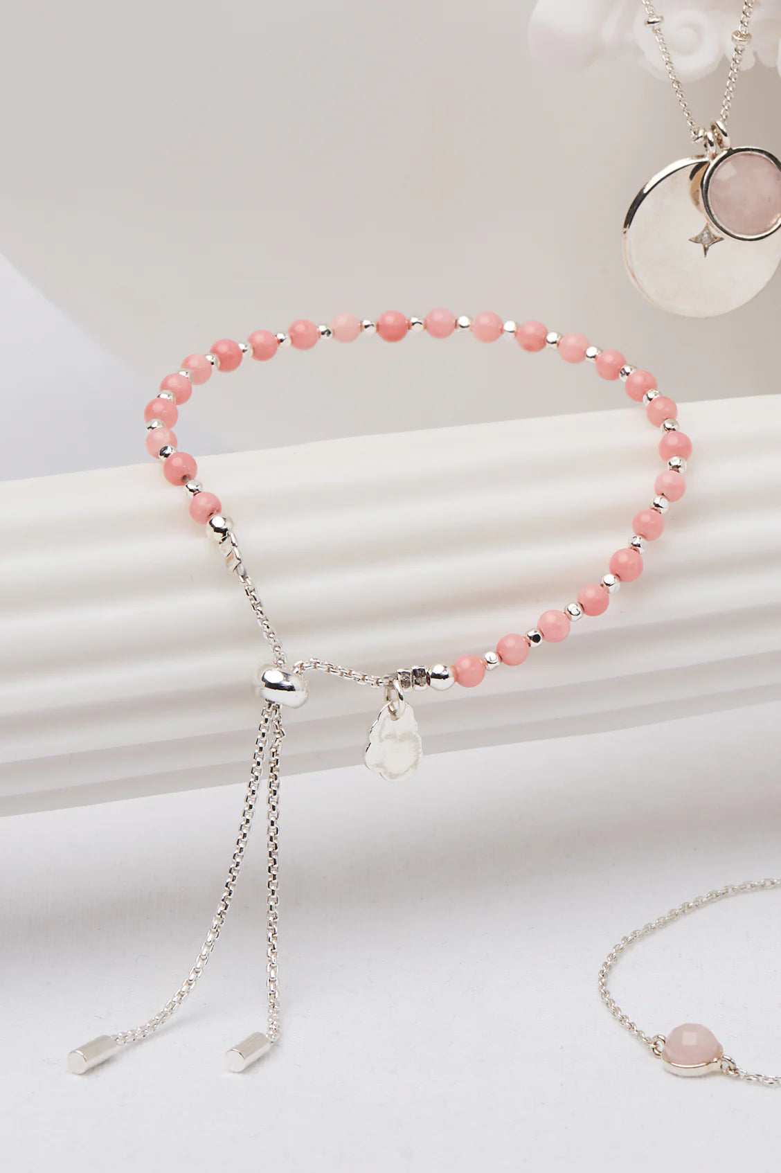The classic Amelia bracelet is dotted with coral agate and silver plated beads with a slider fastening, making it suitable for any wrist size.
