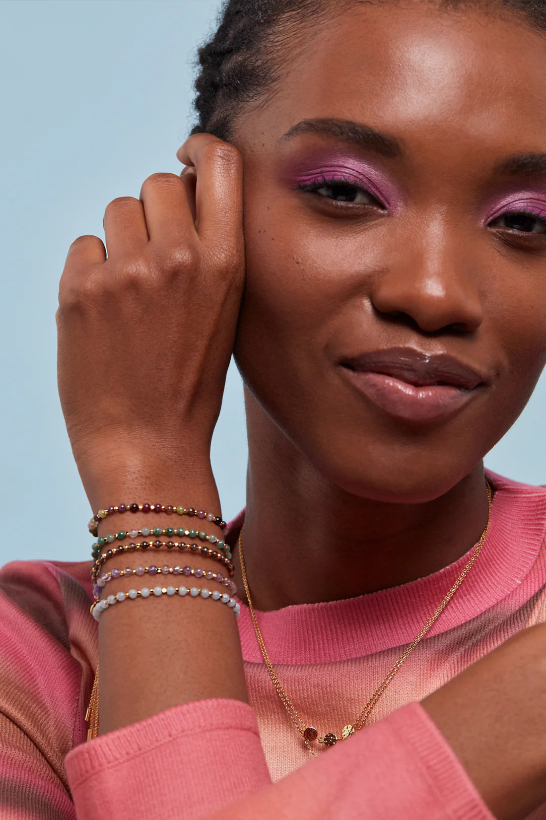 The classic Amelia bracelet is dotted with smoky quartz and gold plated beads with a slider fastening, making it suitable for any wrist size.