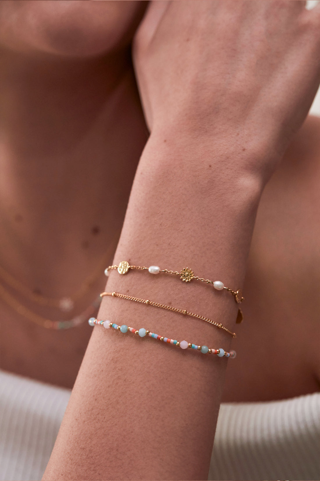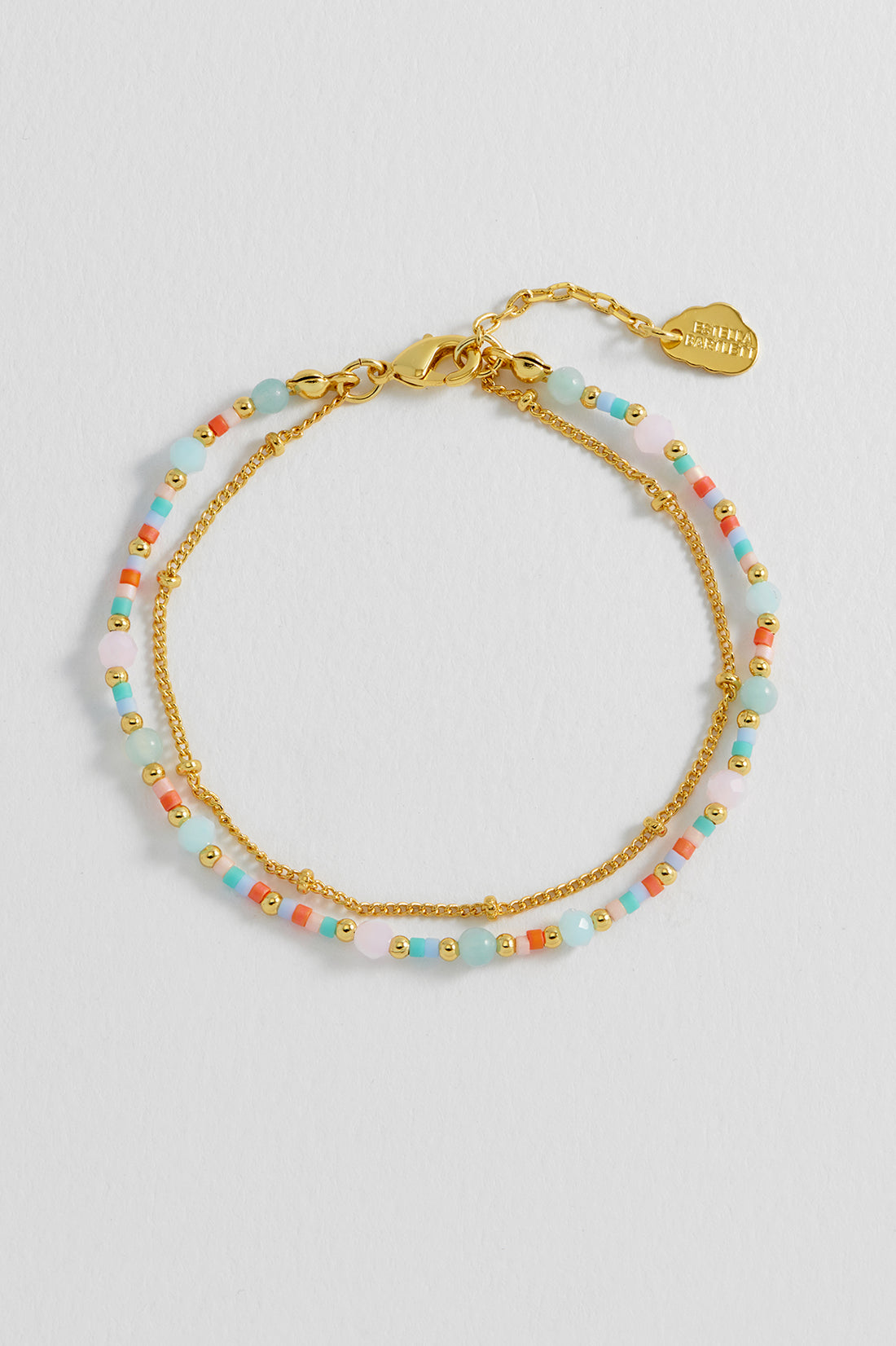 Mini Mixed Colour Duo Chain Bracelet. Made with a mix of Miyuki, natural quartz and glass beads, this bracelet adds a pop of colour to any outfit. With an adjustable chain for the perfect fit, it’s super easy to wear and perfect for layering or wearing on its own