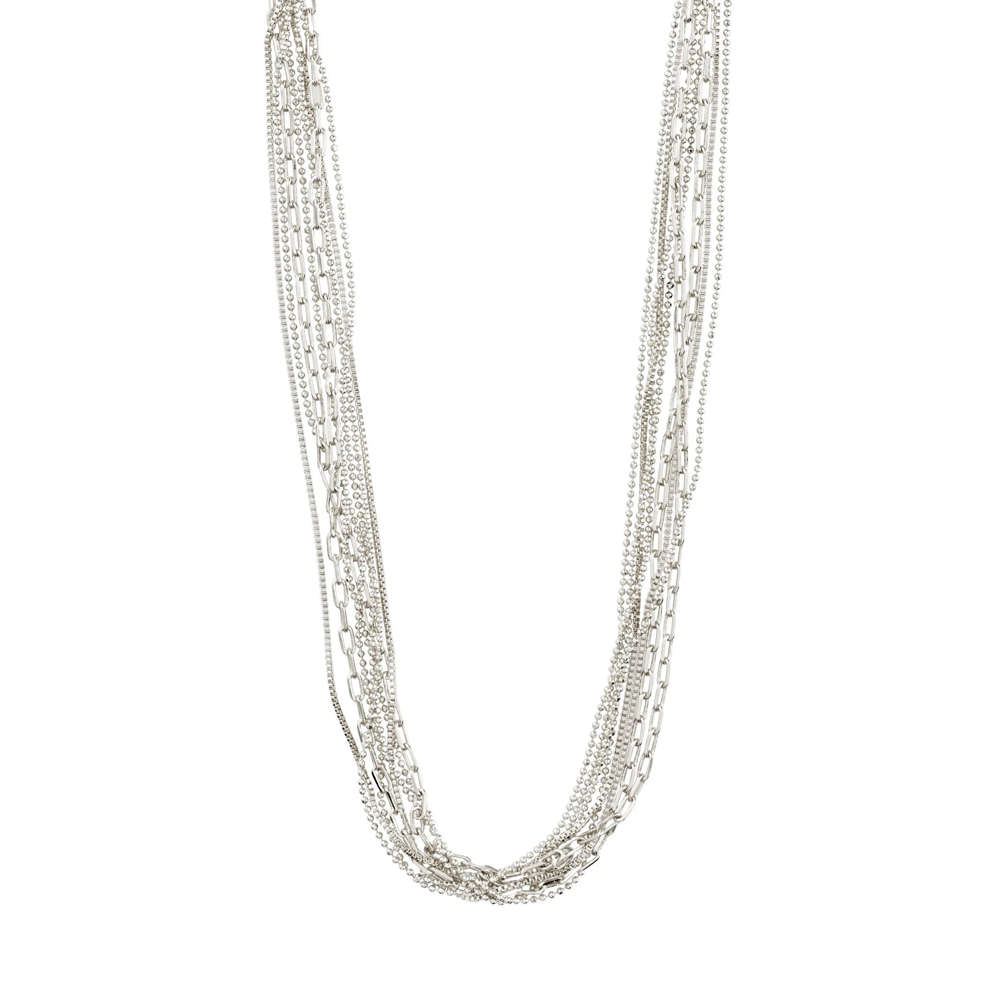 Get stylish! Give your outfit a cool layered look with the silver-plated Lilly necklace composed of eight different chains. Edged box-chains, round ball-chains, and raw cable-chains meet in a randomly perfect and trendy mix that gives an extra touch to both basics and glam. The necklace measures 38 cm and has an extension chain of 9 cm.