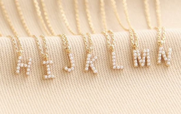 The necklace features a small initial covered in tiny imitation pearls, suspended from a delicate trace chain that fastens via lobster clasp.