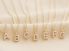 The necklace features a small initial covered in tiny imitation pearls, suspended from a delicate trace chain that fastens via lobster clasp.