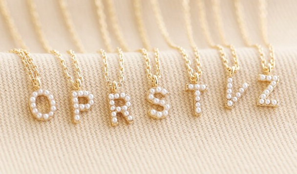 The necklace features a small initial covered in tiny imitation pearls, suspended from a delicate trace chain that fastens via lobster clasp.