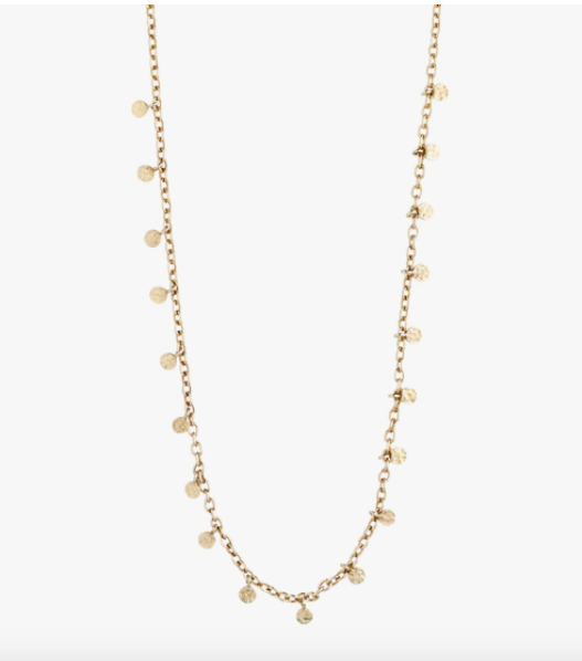 Feminine gold-plated necklace with small round polished pendants along the chain. The delicate necklace is 40 cm long with a 9 cm extension chain. The design was inspired by classic exotic jewellery, and the necklace is the perfect contrast to an edgy outfit. Let your femininity shine through with this charming classic.