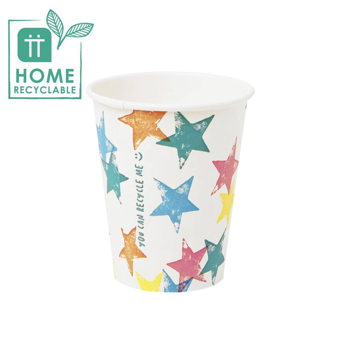 Pack of 8 Home Recyclable Colourful Star Paper Cups by Talking Tables.  A world first, these eco-friendly cups have no plastic lining and both product and packaging are plastic-free. Simply put in your home recycling bin and enjoy your guilt-free, planet-friendly celebration!