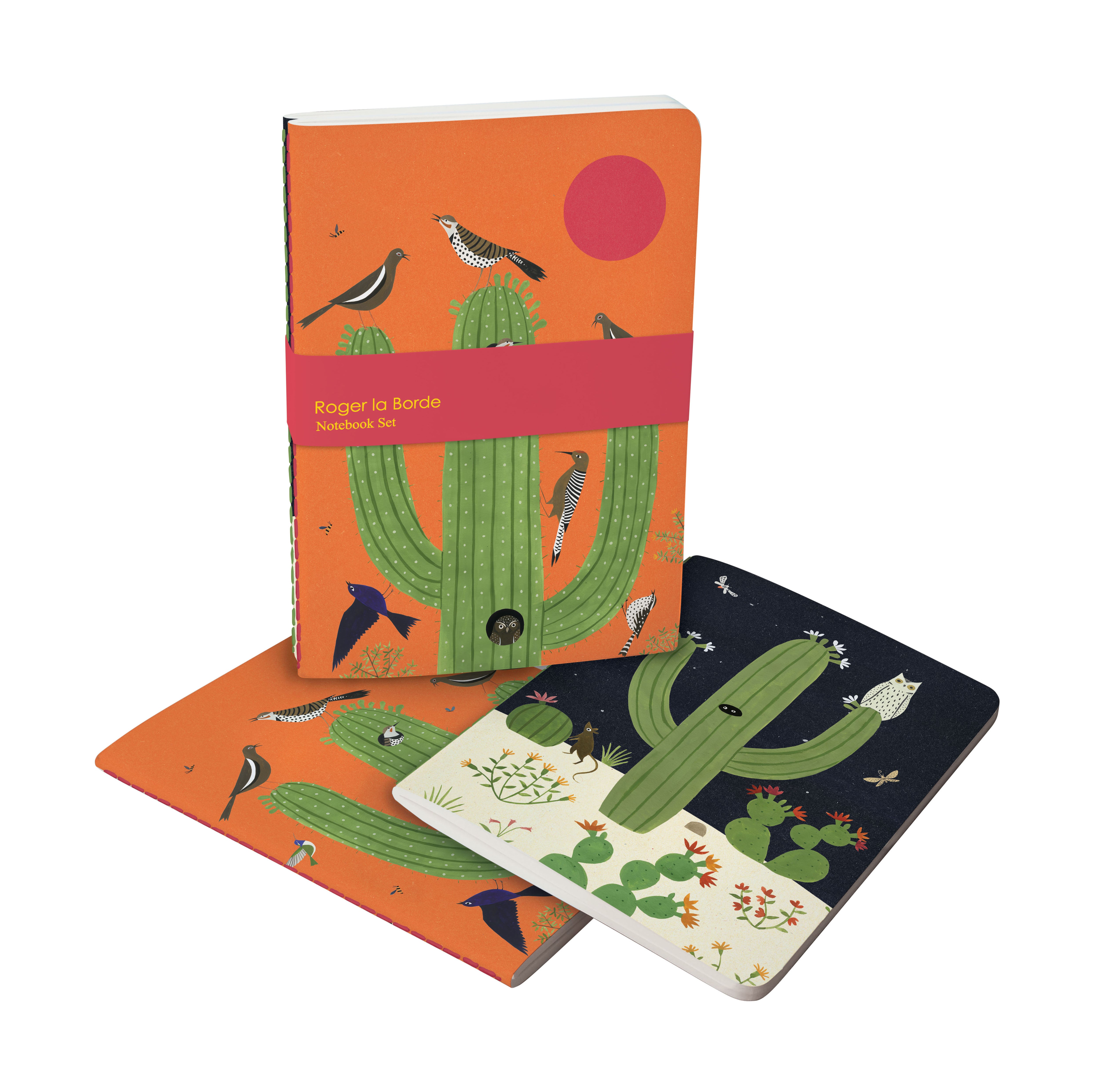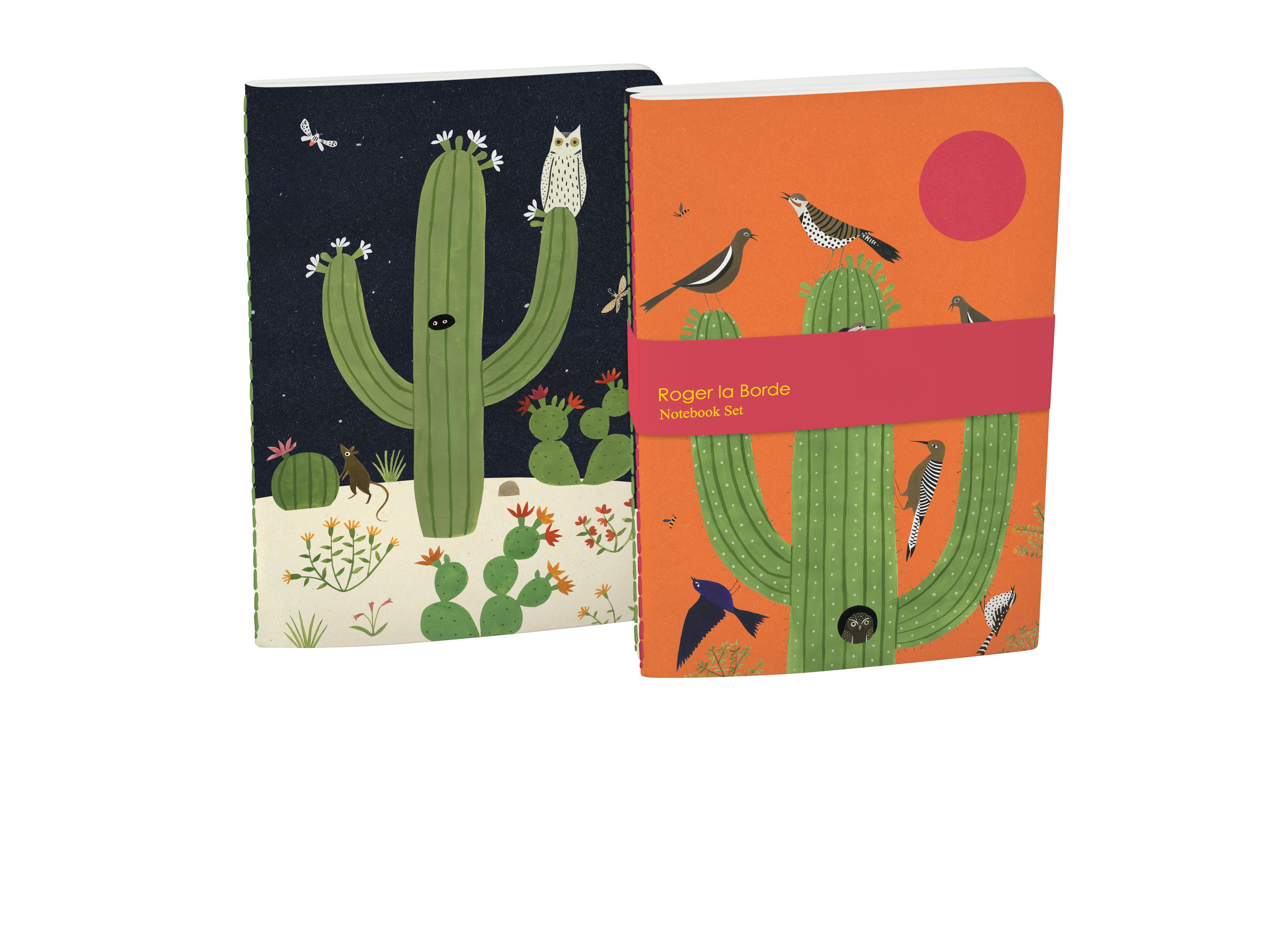 A duo of stylish books in two different designs. These A5 Exercise Books have vibrantly illustrated covers with visible stitched binding on the spine