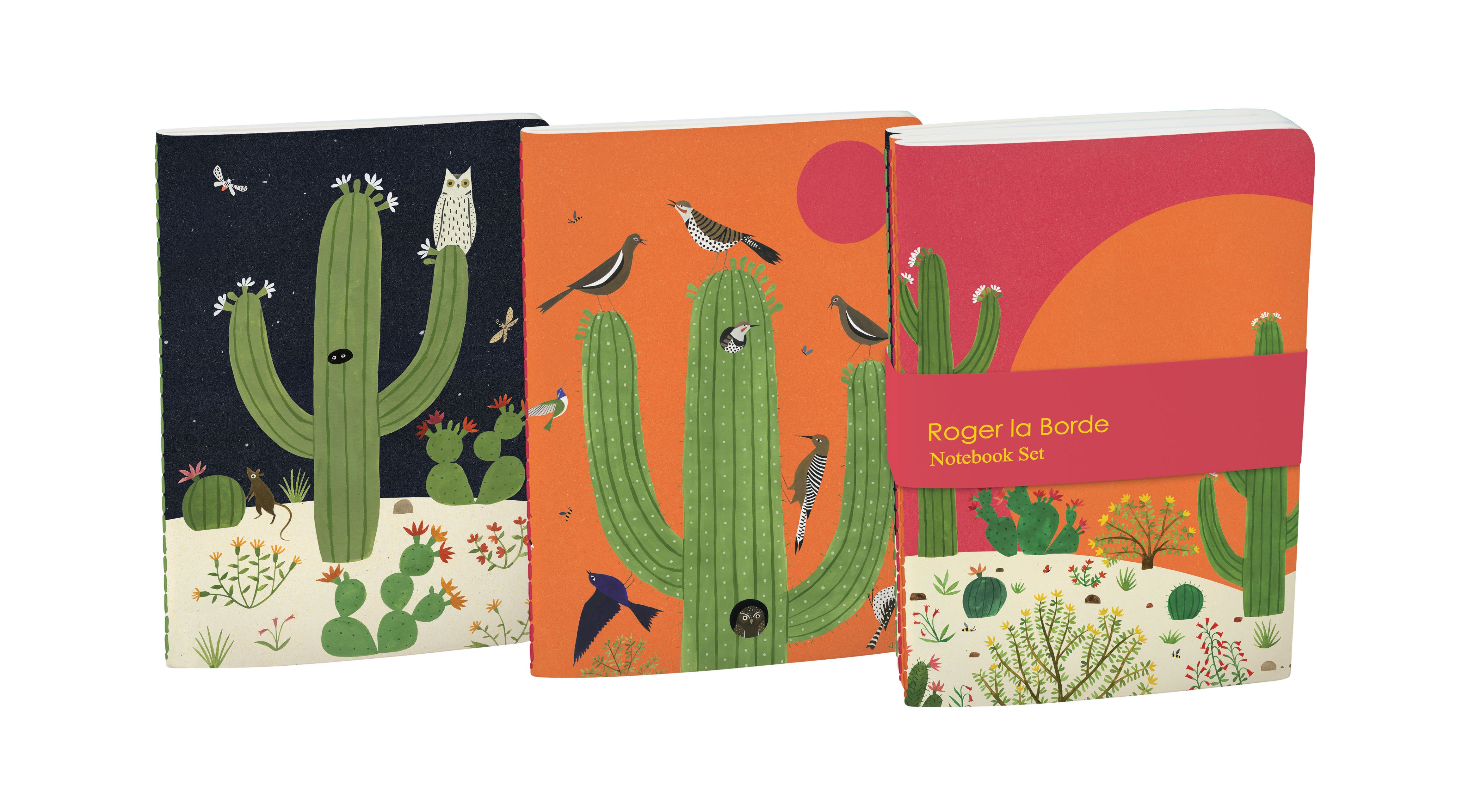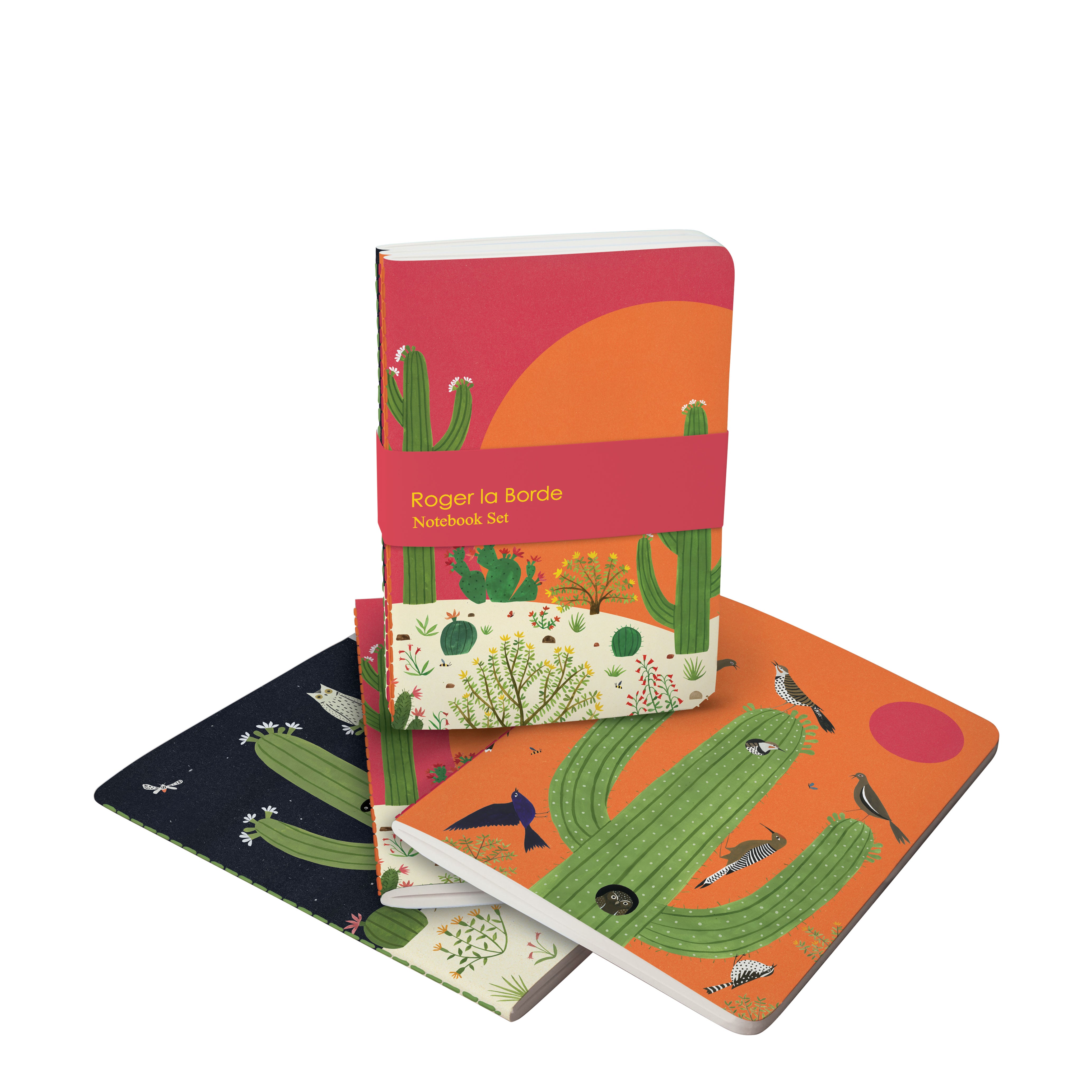 A trio of small stylish books in three different designs. These A6 Exercise Books have vibrantly illustrated covers with visible stitched binding on the spine.