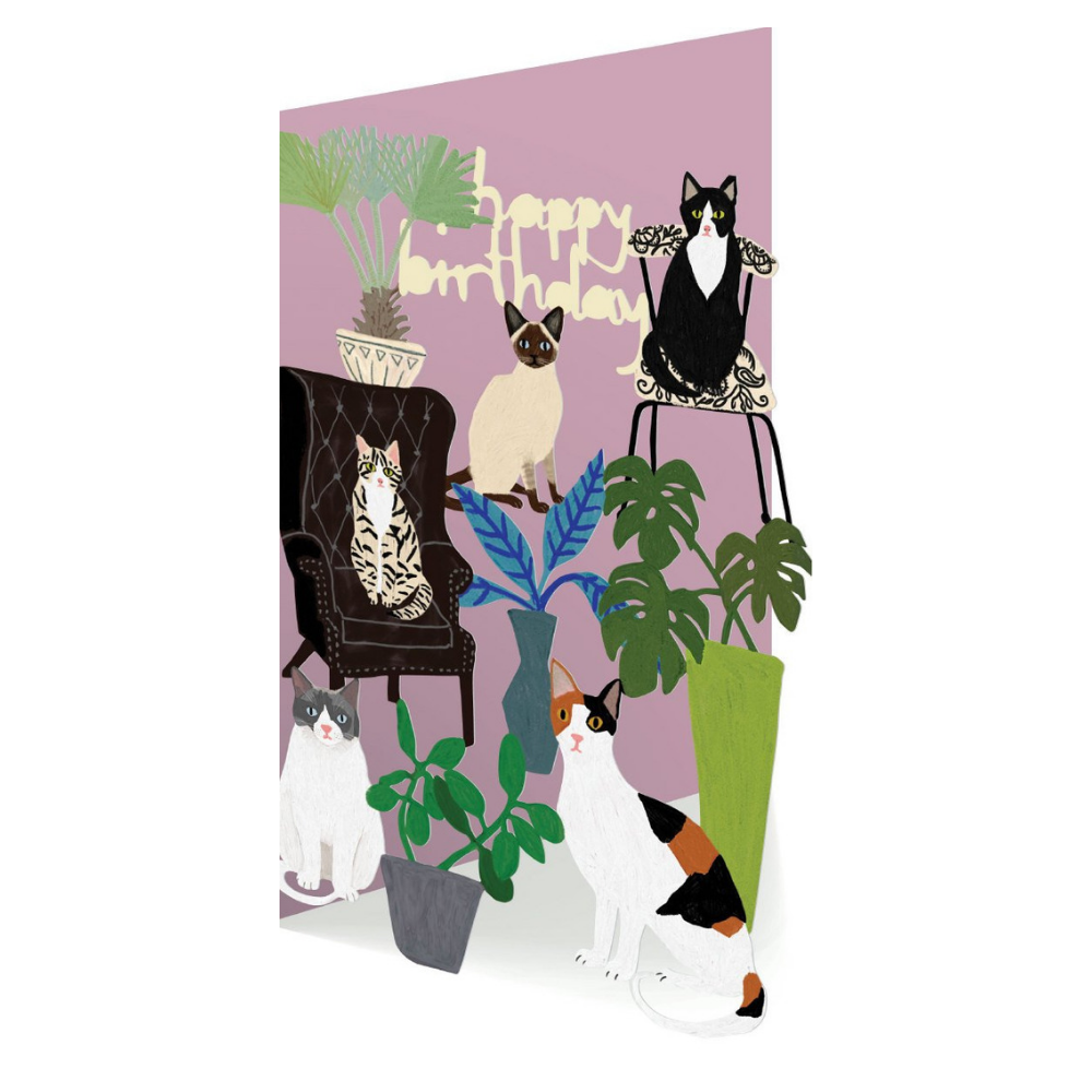 This card features a mix of different cats amongst tropical plants. Delicately lasercut, the image stands out against a pink background and features the text 'Happy Birthday'. Blank inside, there is space both there and on the back from your own personal message.
