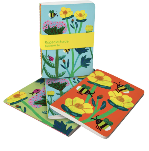 A trio of small stylish books in three different designs. These A6 Exercise Books have vibrantly illustrated covers with visible stitched binding on the spine.