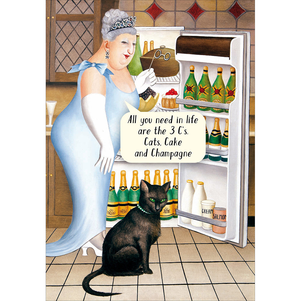 - Front reads: All You Need In Life Are The 3 C's. Cats, Cake And Champagne.