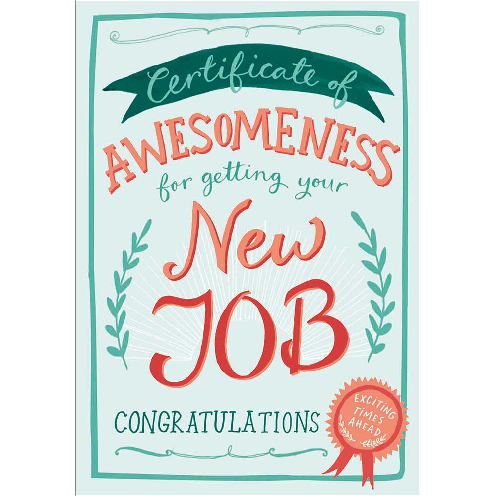 - Front reads: Certificate Of Awesomeness For Getting Your New Job - Congratulations - Exciting Times Ahead