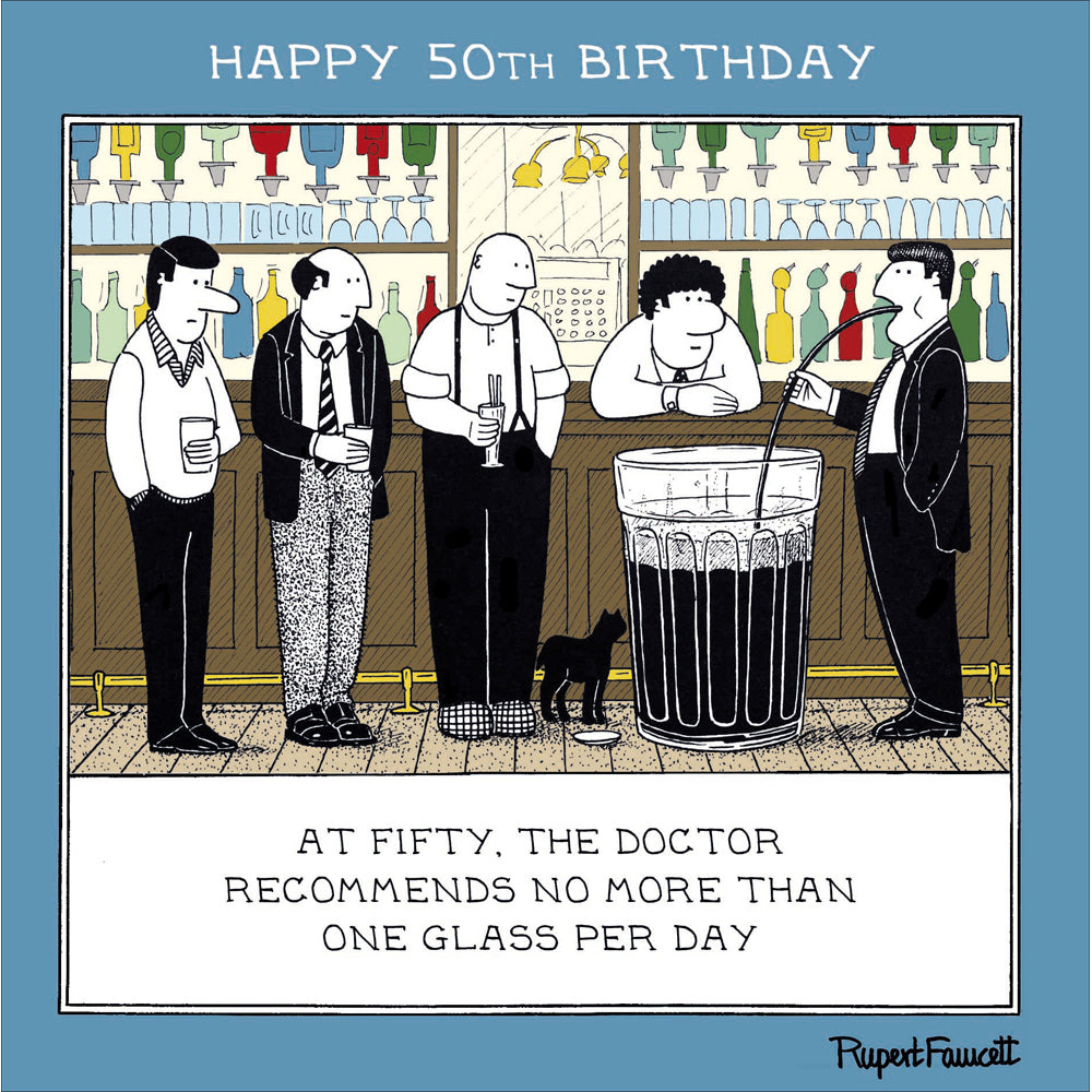 - Message on front: Happy 50th Birthday - At fifty, the doctor recommends no more than one glass per day