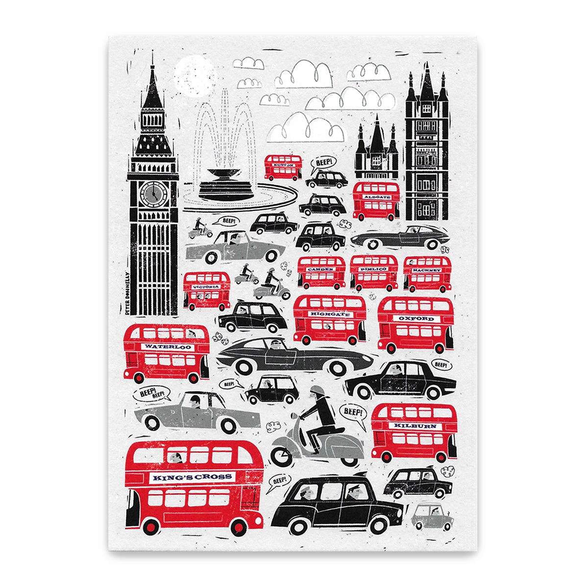 This postcard from UStudio is great for sending a quick message, or using as a mini-print! Designed by Peter Donnelly, it features a London street filled with bright red busses and black cabs, with Big Ben in the background.
